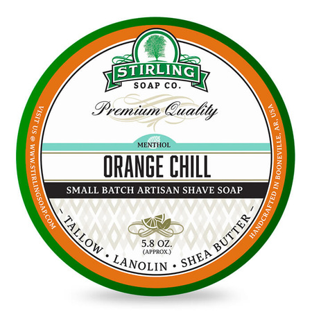 - Stirling Orange Chill to mydło do golenia na bazie łoju wołowego o intensywnie cytrusowym zapachu. Naturalna nuta pomarańczy i mentol zapewniają silne chłodzenie, gęstą pianę i wysoki komfort golenia. 170 ml, Made in USA.