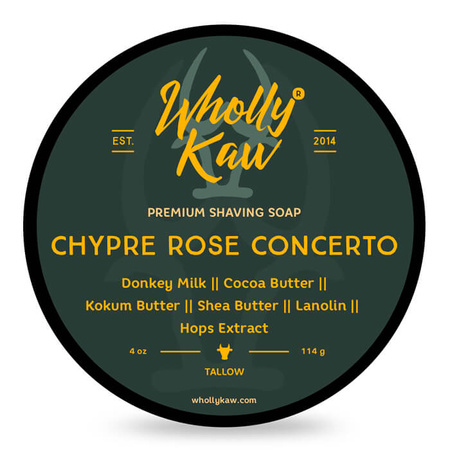 - Wholly Kaw Chypre Rose Concerto to luksusowe mydło do golenia na bazie tłuszczu zwierzęcego z dodatkiem mleka osła i masła kakaowego. Delikatnie pielęgnuje skórę, łagodzi podrażnienia i pozostawia subtelny kwiatowy zapach. 114 g. Made in USA.