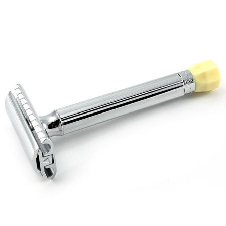 Dwuczęściowa konstrukcja: prosta i bezpieczna wymiana żyletki poprzez odkręcenie dolnej części uchwytu.