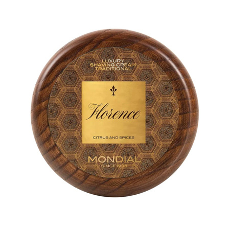 - Mondial Florence to mydło do golenia w kremie stałym, zamknięte w elegancej, ręcznie wykonanej misce z drewna. Naturalne składniki chronią i nawilżają skórę, a aromatyczny zapach Florence sprawia, że golenie staje się przyjemnym, luksusowym rytuałem.
