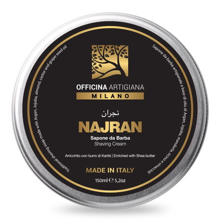 Officina Artigiana Najran Shaving Soap 150ml to wyjątkowe mydło do golenia stworzone dla mężczyzn, którzy cenią odwagę, elegancję i niezwykłe doznania zapachowe w codziennym rytuale golenia. To produkt, który nie tylko oczyszcza i przygotowuje skórę do idealnego golenia, ale też otula ją intensywną, drzewno-dymną kompozycją, pełną charakteru i osobowości.