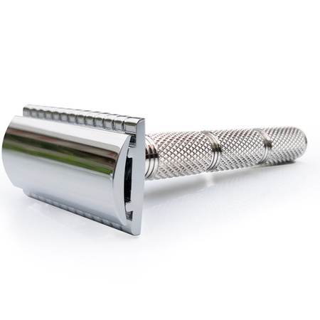 - Razorock Mentor – mocniejsza głowica DE i pewny chwyt dzięki głęboko frezowanej rękojeści z 316L. Jedno przejście i skóra gładka jak stół bilardowy! Polecana początkującym jak i zaawansowanym golarzom!
