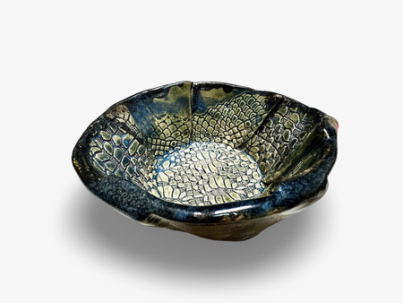 Wnętrze miski posiada nieregularną, płytką strukturę inspirowaną łuską, widoczną na zdjęciu: