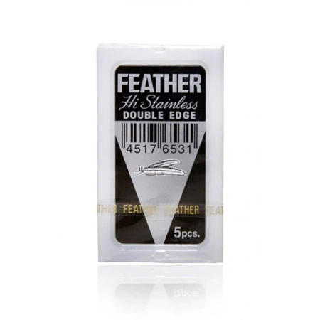 Opakowanie zawiera 5 żyletek Feather Hi-Stainless – w eleganckim pudełku z tworzywa.
